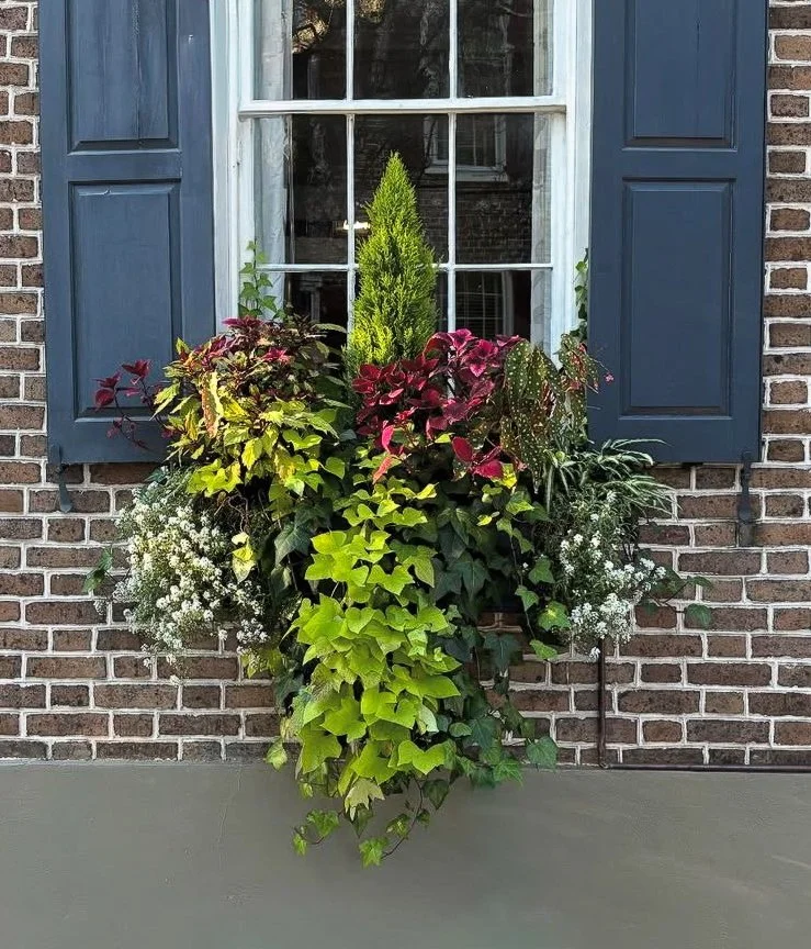 Recognized as Charleston’s premier window box designers, we honor this tradition by meticulously crafting each custom installation, carefully selecting resilient, seasonal blooms that perfectly frame and enhance your building's distinct character.